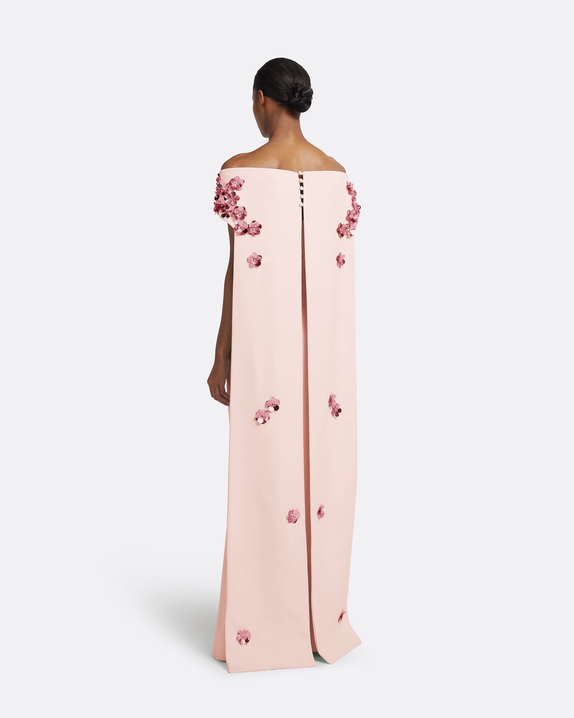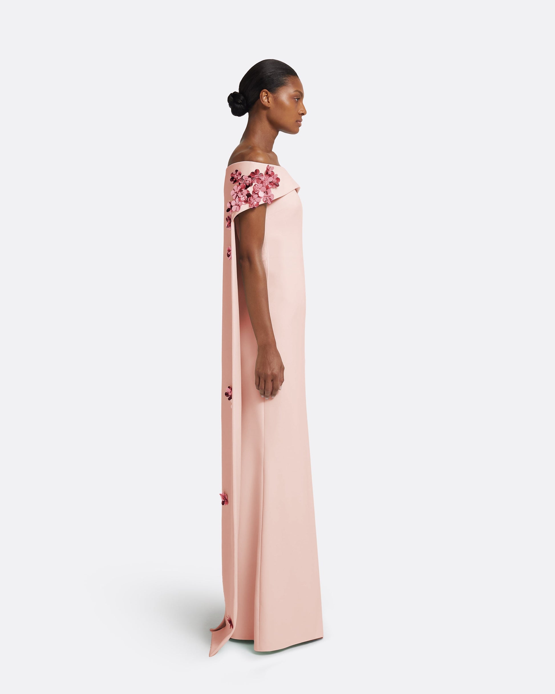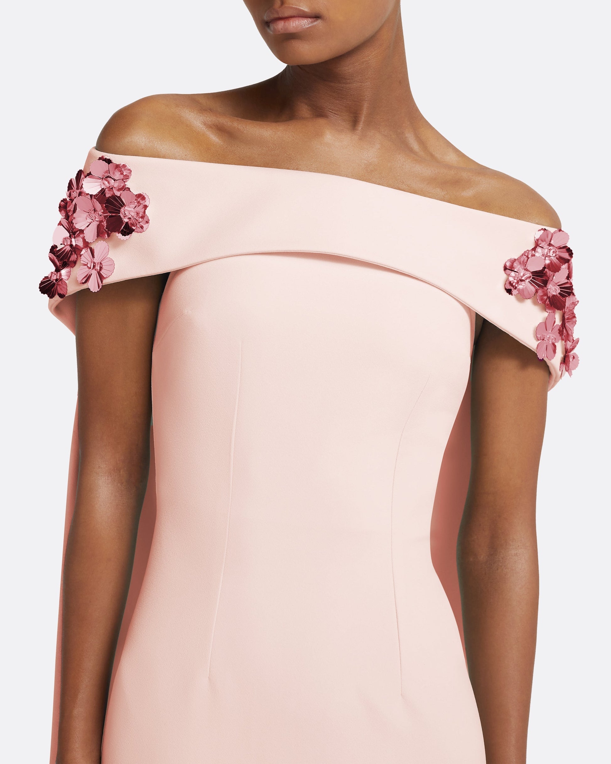 Off-the-shoulder harness in pale pink, adorned with pink Flora embroidery, with a long trailed back with a deep split. Combined with full-length fitted strapless dress in pale pink.