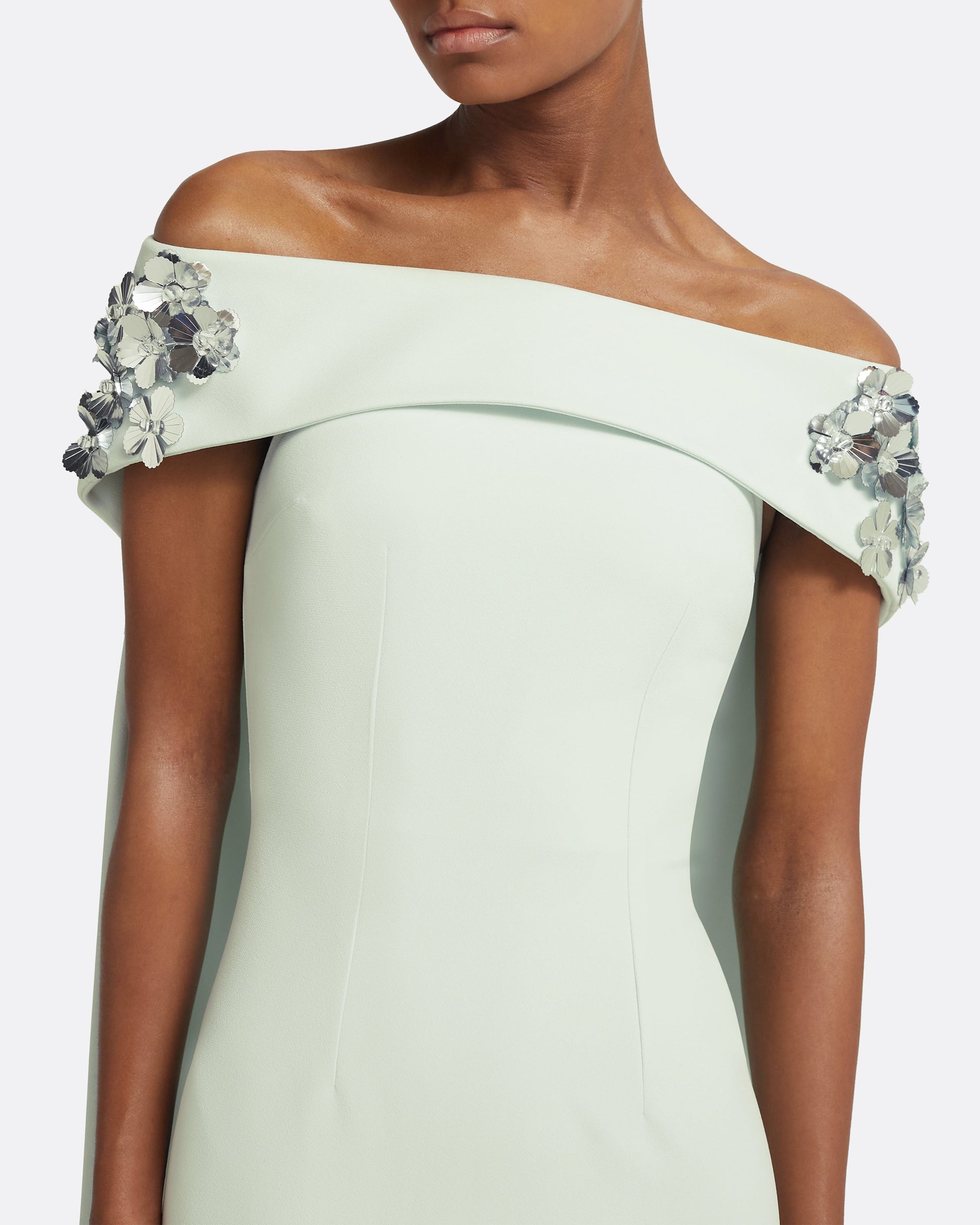 Off-the-shoulder harness in spearmint, adorned with silver Flora embroidery, with a long trailed back with a deep split. Combined with full-length fitted strapless dress in spearmint.