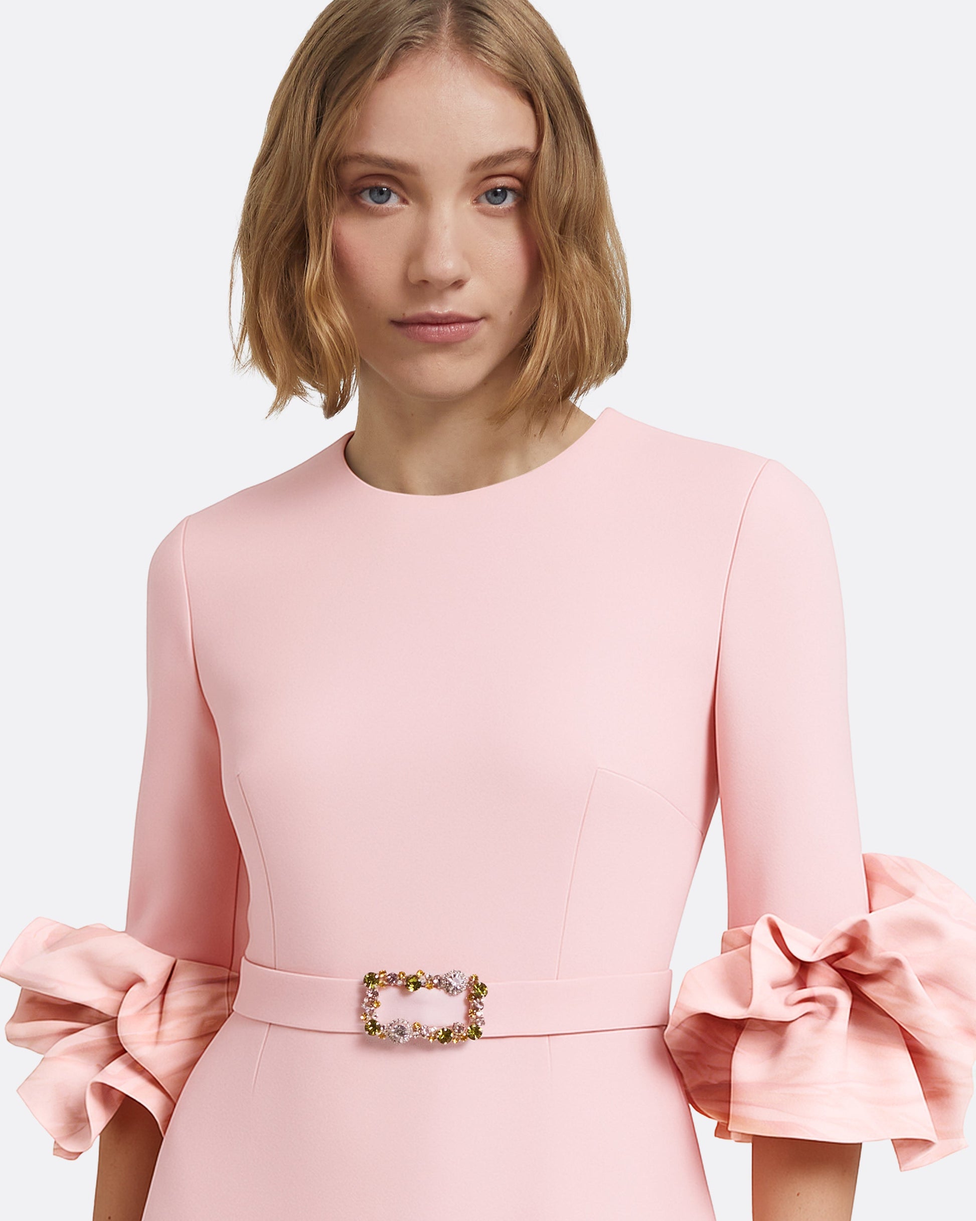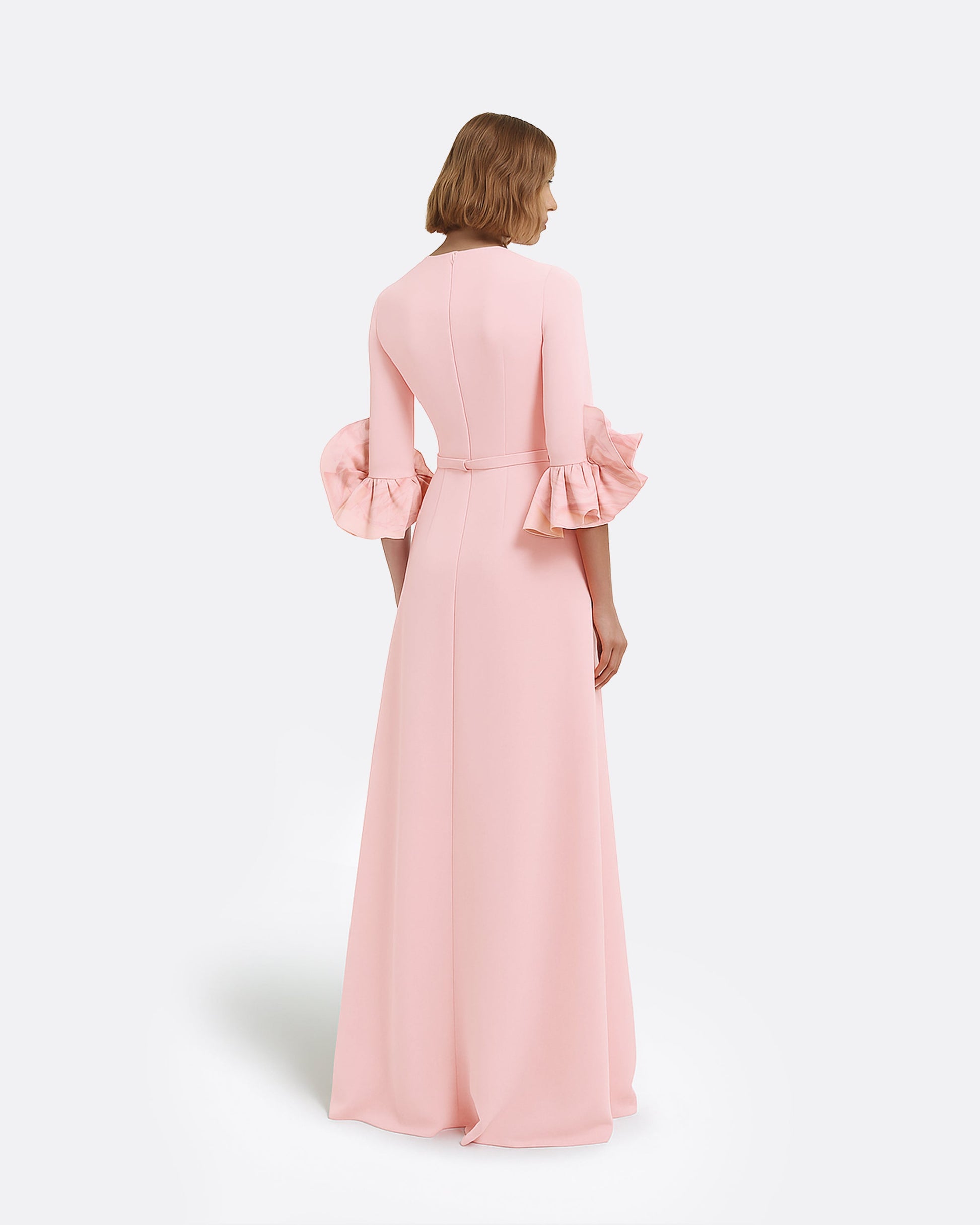 From the Pre-Fall '25 collection, the Belen dress in lychee is a study in refined contrast. Its flowing silhouette is complemented by sculptural accents, offering a commanding yet graceful presence.