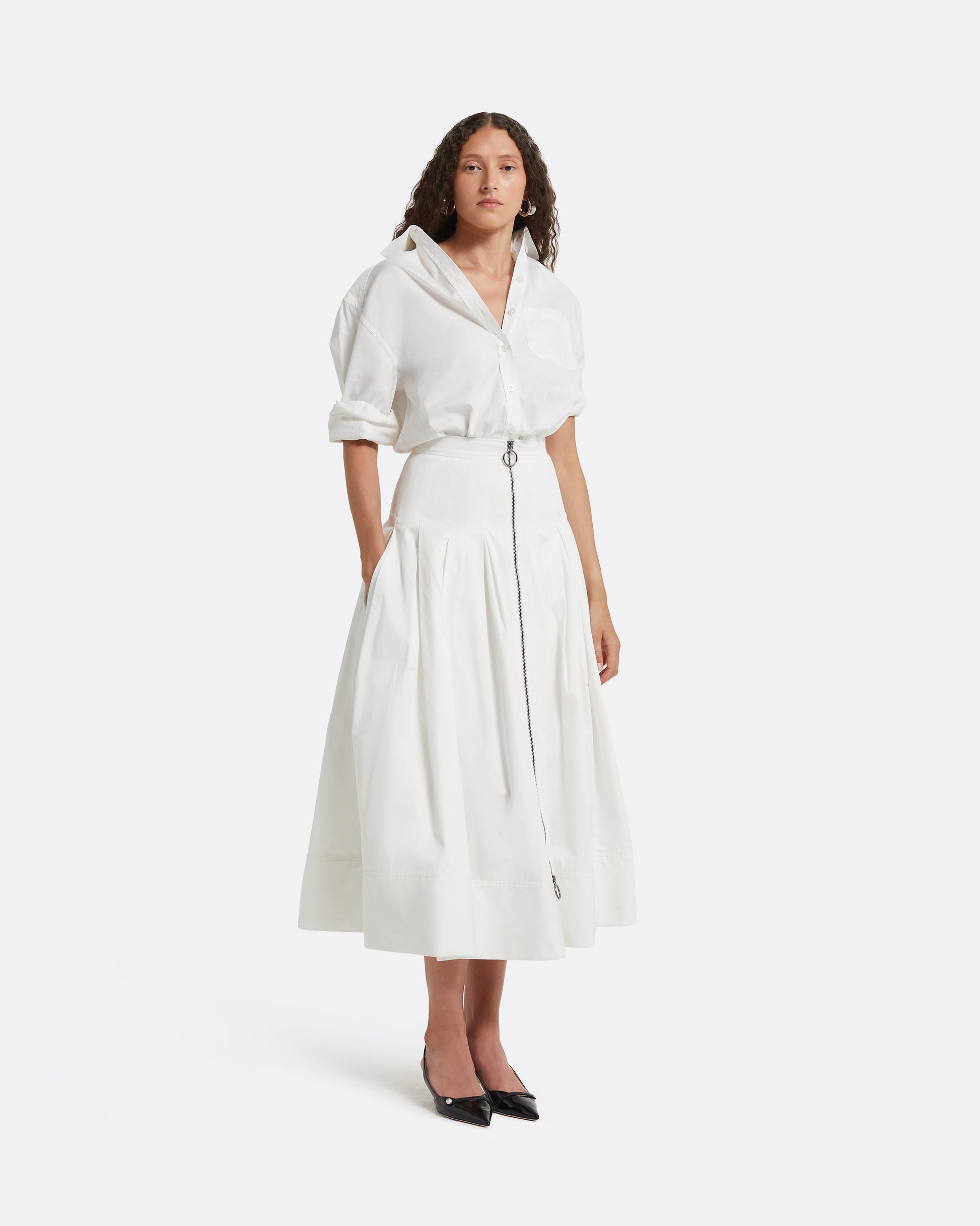 Full skirt with front zip closure and pleated detail in ivory Paloma Cotton.