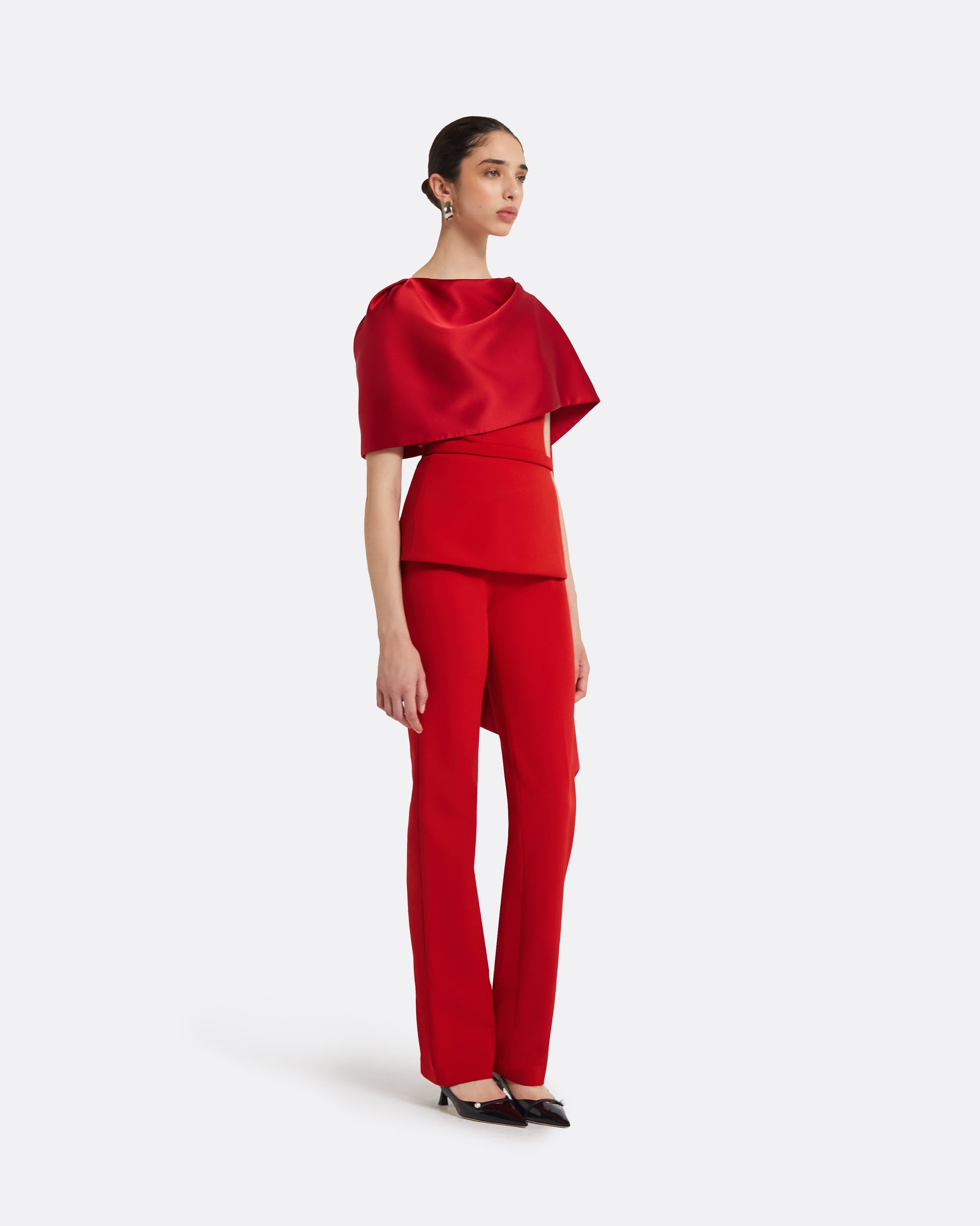 Classic Top With Elegant Cape Detail in crimson Shine Satin Stretch on dazzling red Heavy Crepe.
