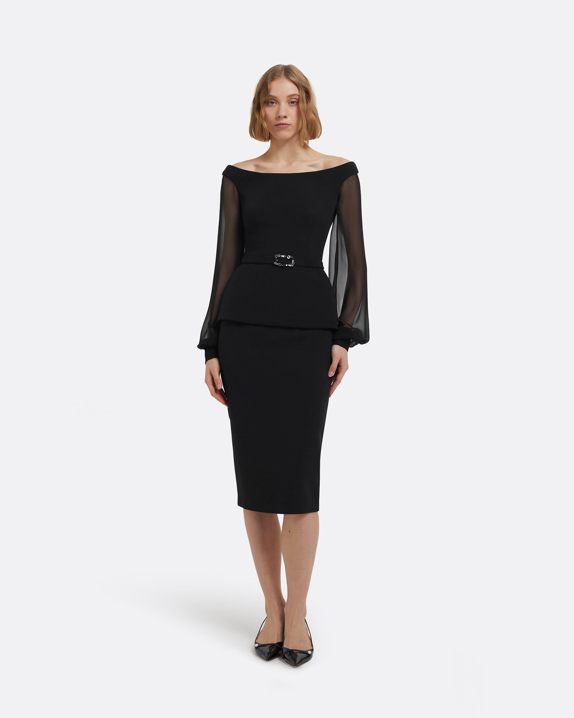 Knee length pencil skirt in Black.