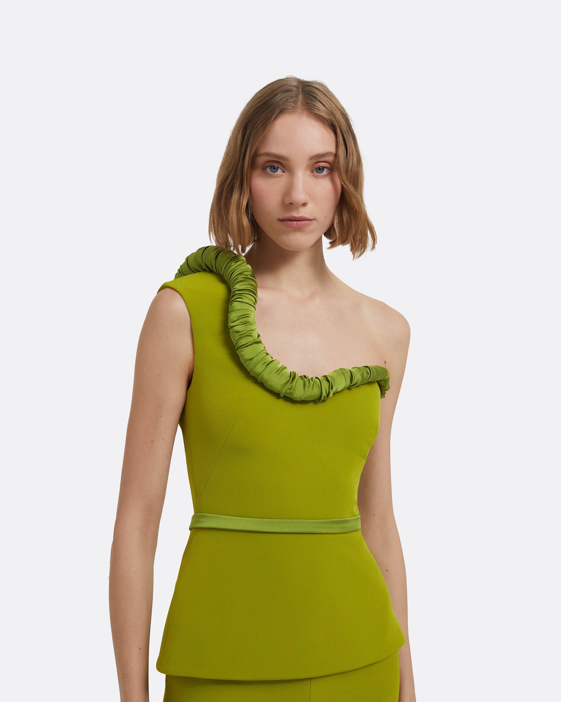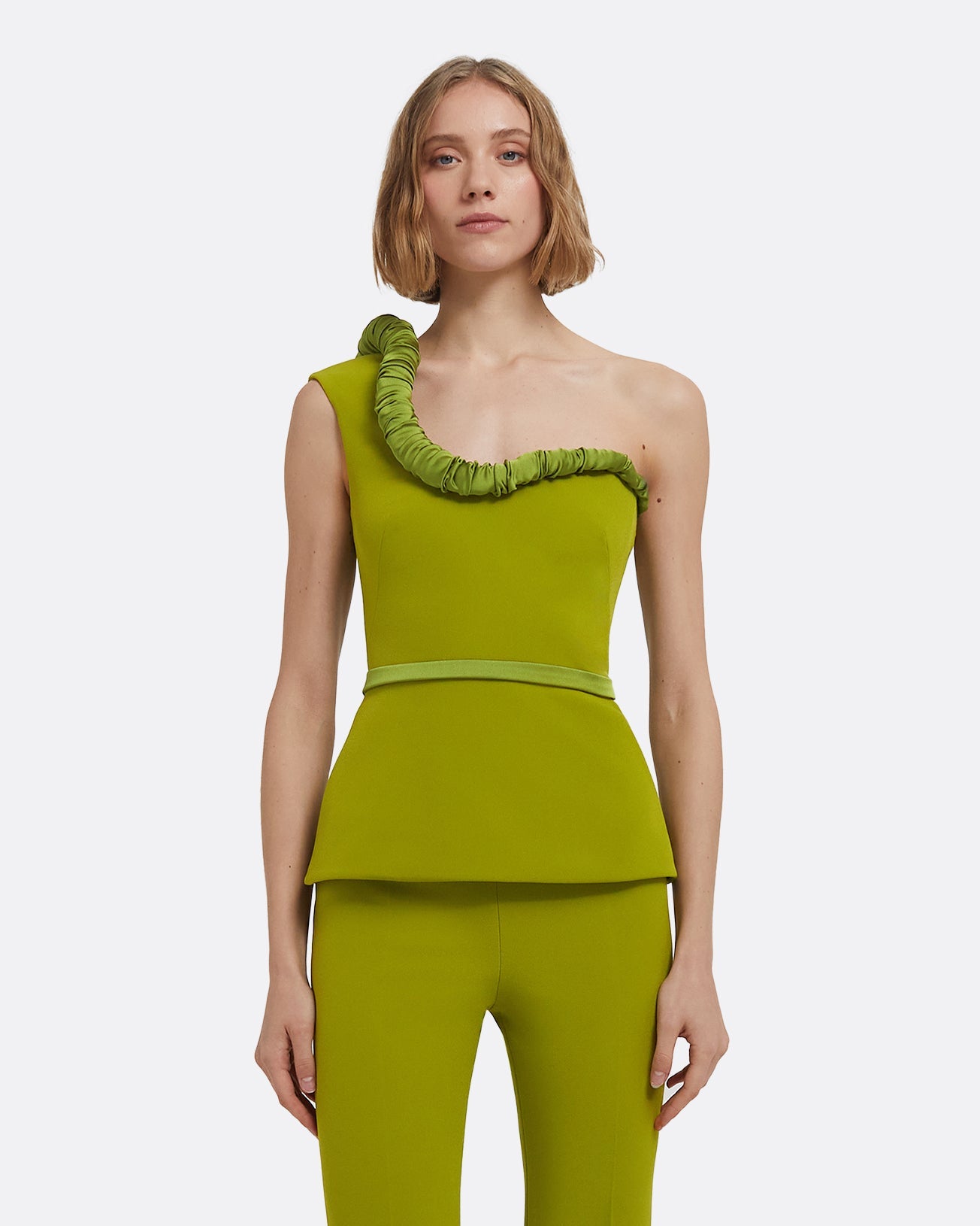 From the Pre-Fall '25 collection, the Kina top in woodbine is a statement in modern sophistication, offering a sleek, architectural aesthetic that defines the waist with effortless refinement.