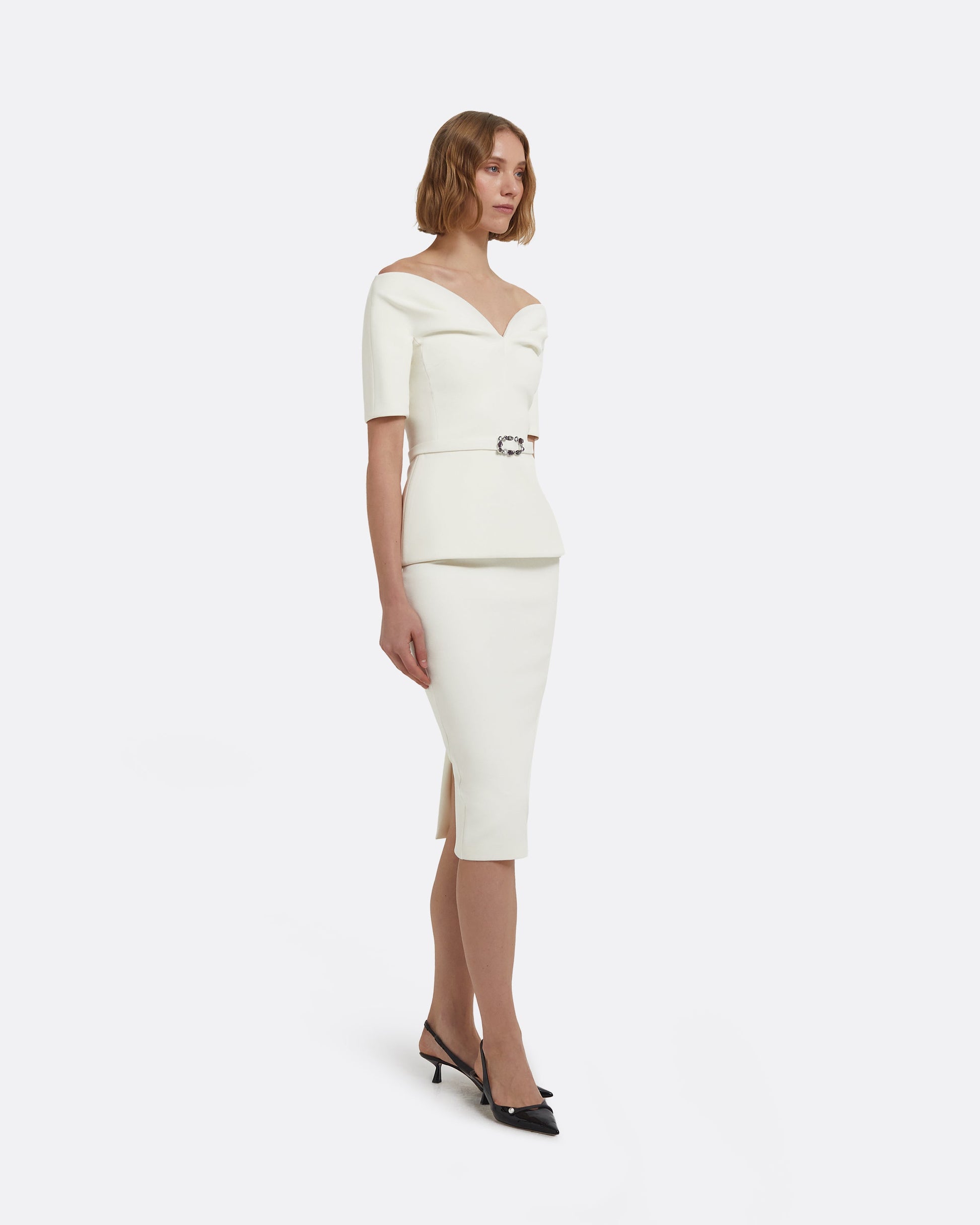 From the Pre-Fall '25 collection, the Lyddie top in ivory is a study in contrast, where soft structure meets precise detailing, finished with metallic accents for a refined edge.