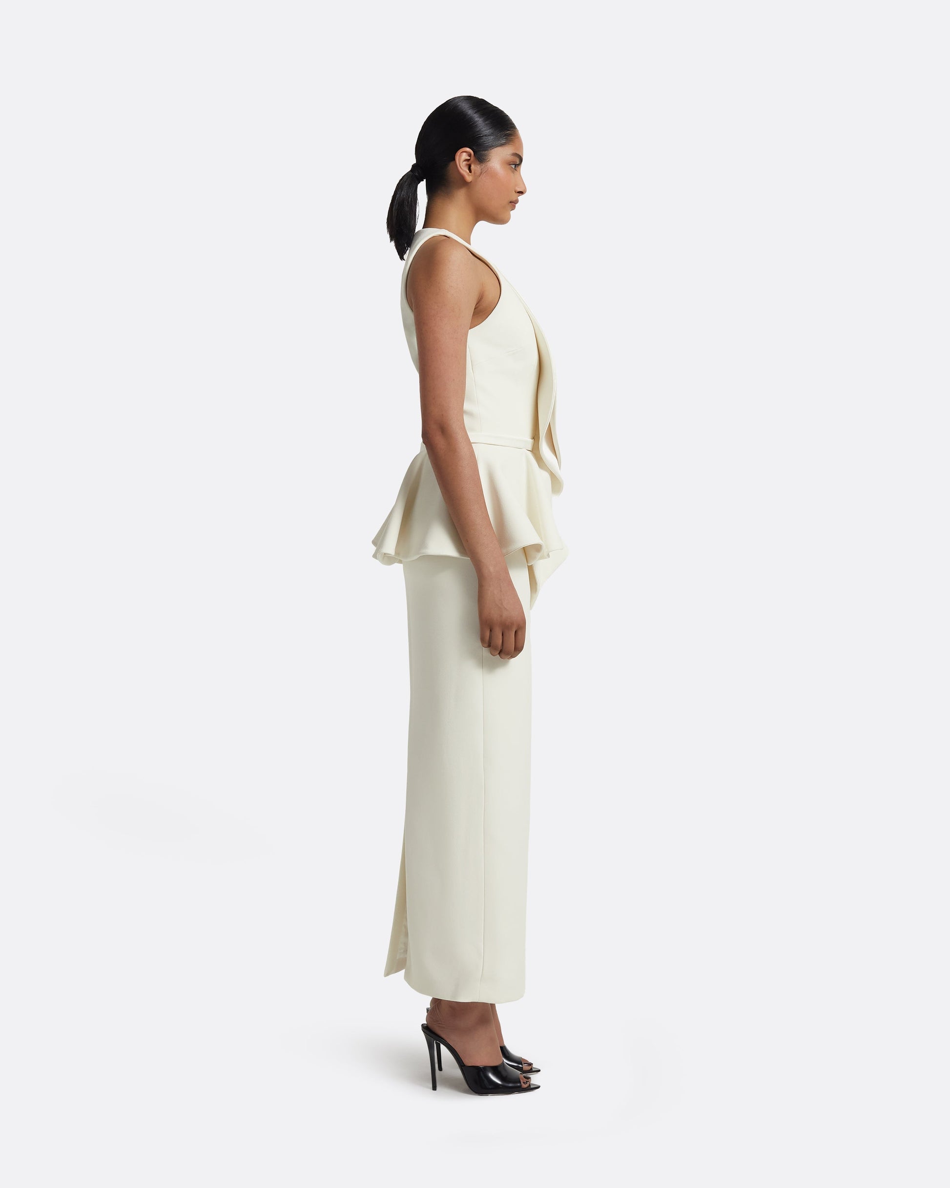 From the Autumn Winter '25 collection, the Riya dress in ivory brings a sense of sculptural ease to occasion dressing. Its softly contoured lines and fluid drape offer a quiet yet assured statement.