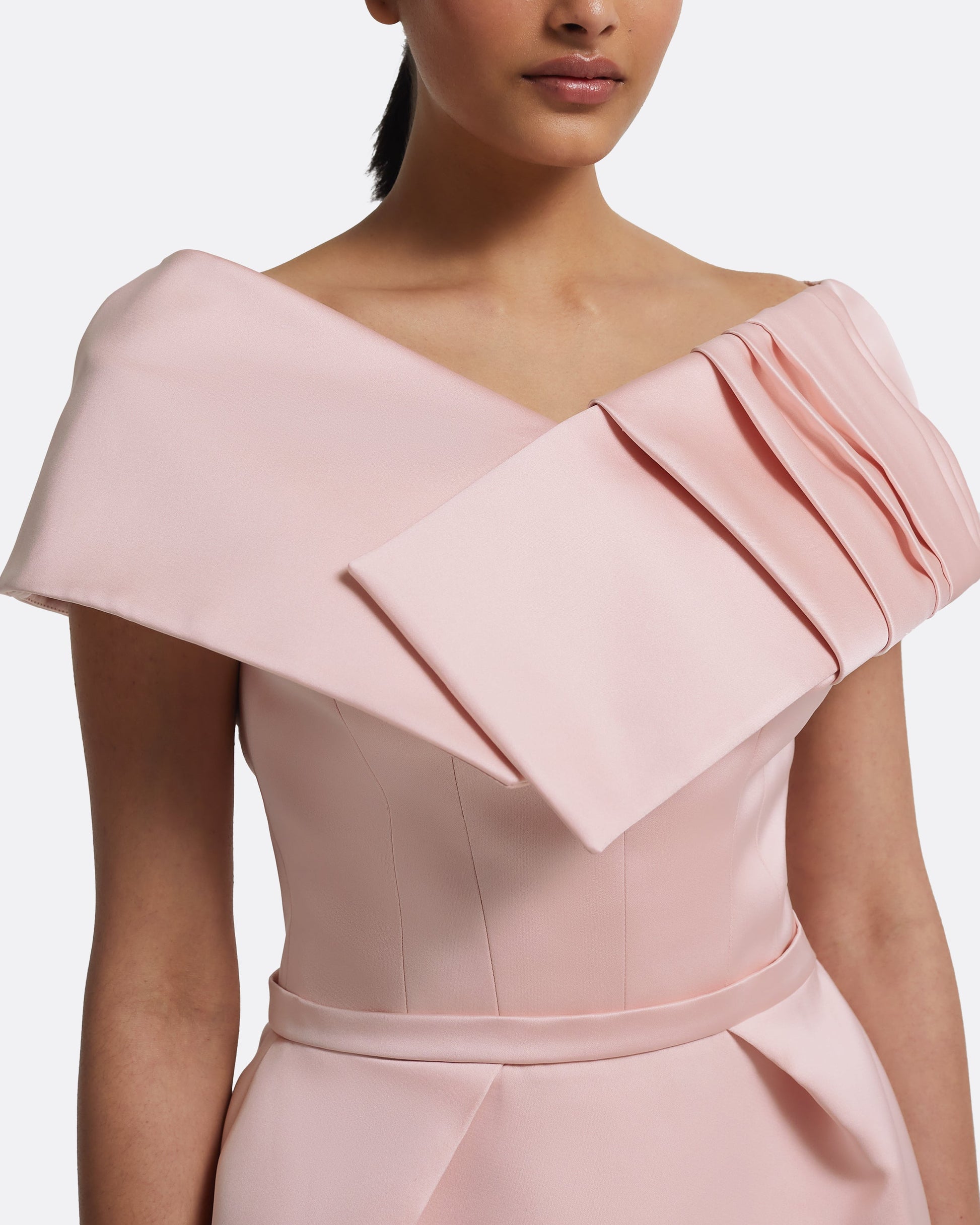 From the Autumn Winter '25 collection, the Senka dress and Hanabi harness in lotus bloom create a layered composition of clarity and movement. The off-shoulder drape introduces a sculptural layer over the streamlined base, creating a silhouette that feels both decisive and refined.